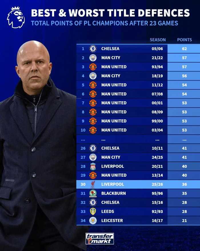 利物浦在英超前23轮比赛后战绩并不如预期。德转也发布榜单,统计了各赛季英超卫冕冠军23轮后的积分榜。